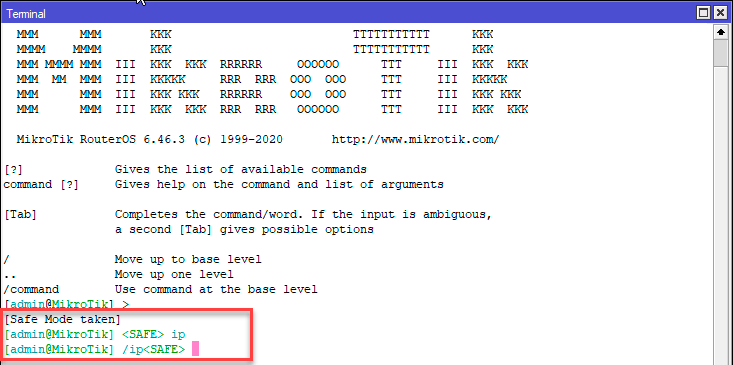 Работа в безопасном режиме имеет свои особенности, которые нужно обязательно учитывать. Количество хранимых шагов ограничено, согласно документации, роутер может сохранять в памяти не более 100 действий, если вы превысите это количество, то сеанс автоматически выйдет из безопасного режима и изменения не смогут быть отменены. Поэтому рекомендуется вносить изменения небольшими порциями, каждый раз выходя из безопасного режима и входя в него повторно. В терминале для этого можно использовать двойное нажатие Ctrl+x.