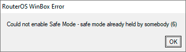 При совместной работе нескольких администраторов может возникнуть ситуация, когда одна из сессий уже находится в безопасном режиме, попытка включить безопасный режим еще в одной сессии через Winbox не увенчается успехом: