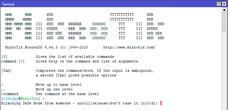 Чтобы обезопасить себя от перехвата безопасного режима следует перед внесением очередных изменений выключить безопасный режим и снова включить. Если вы работаете через Winbox, то столкнетесь с описанной выше ошибкой, а в терминале получите запрос на захват режима. При возникновении подобной ситуации мы рекомендуем сразу связаться с коллегами и согласовать последующие действия.