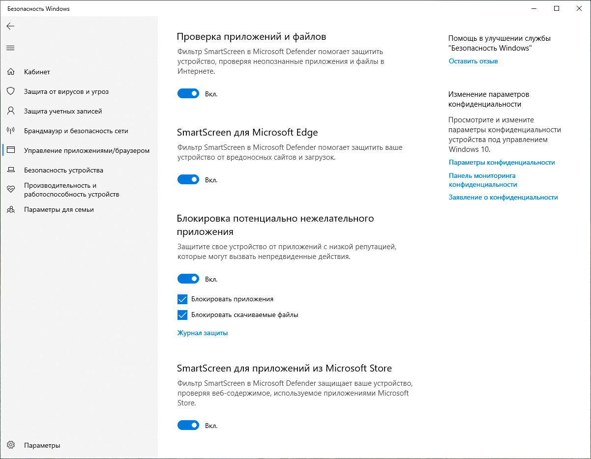 Затем найдите раздел Блокировка потенциально нежелательного приложения. Кроме возможности включить или выключить данную опцию, доступна настройка действий: мы можем блокировать такие приложения или только запретить их загрузку (работает только в браузере Microsoft Edge). Никаких иных настроек нет,