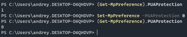 1Set-MpPreference -PUAProtection 0
