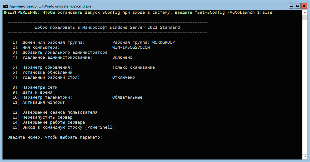 После чего будет запущена утилита SConfig для базовой настройки сервера, но автоматический ее запуск присутствует только в Windows Server 2022, в других редакциях для ее вызова введите: