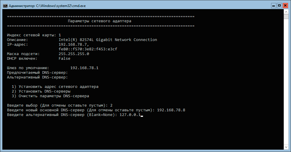 Начать следует с пункта 2 и установить имя компьютера согласно запланированному. Затем перейти к пункту 7 и включить удаленный рабочий стол для доступа к серверу по RDP. После чего переходим в пункт 8 и настраиваем сеть и указываем адреса DNS-серверов. На последних следует остановиться более подробно. Текущие рекомендации советуют указывать в качестве первичного сервера DNS адрес любого иного контроллера домена, дополнительным - адрес локальной петли (127.0.0.1). Таким образом для первого сервера укажем 192.168.78.8 и 127.0.0.1, для второго: 192.168.78.7 и 127.0.0.1.