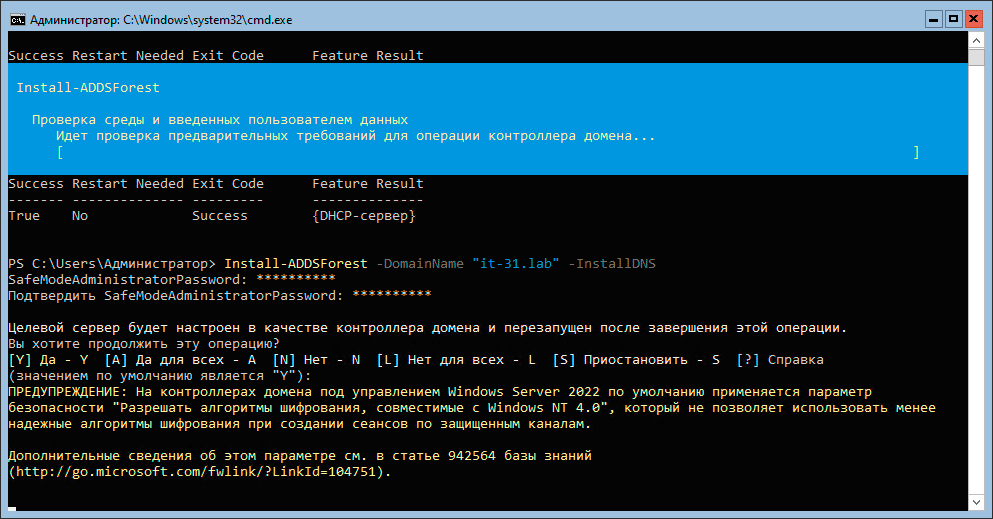 Эта команда повысит сервер до контроллера, создаст новый лес с указанным доменом в нем, а также установит DNS-сервер и сделает контроллер Глобальным каталогом. При этом вам потребуется указать пароль для режима восстановления и подтвердить автоматическую перезагрузку.