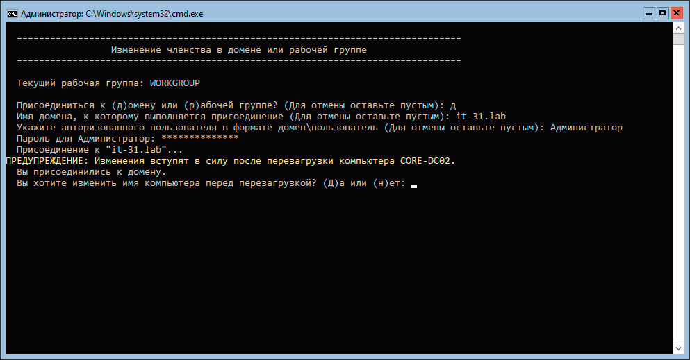 Теперь перейдем на CORE-DC02 и первым делом попробуем ввести его в домен, воспользовавшись цифровым пунктом 1 в SConfig, если нигде не допущено ошибок, то эта задача увенчается успехом. Таким образом мы убедились, что созданный нами контроллер работает, поэтому перезагружаемся и идем дальше.