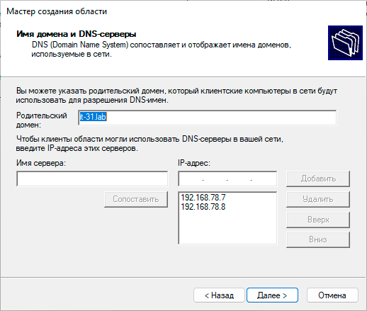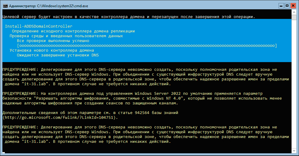 1Install-ADDSDomainController -DomainName "it-31.lab" -InstallDns -Credential (Get-Credential "IT-31\Администратор")