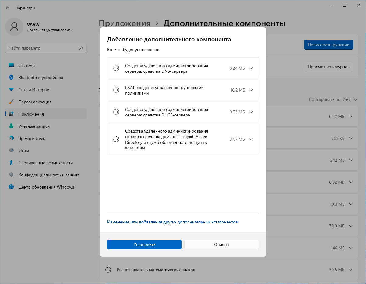 Для дальнейшей настройки и управления созданной инфраструктурой мы будем использовать привычные инструменты из пакета RSAT, в Windows 10 / 11 их можно получить в разделе Приложения - Дополнительные компоненты приложения Параметры. Нам потребуются оснастки для управления Active Directory, DNS и DHCP, а также редактор групповых политик.