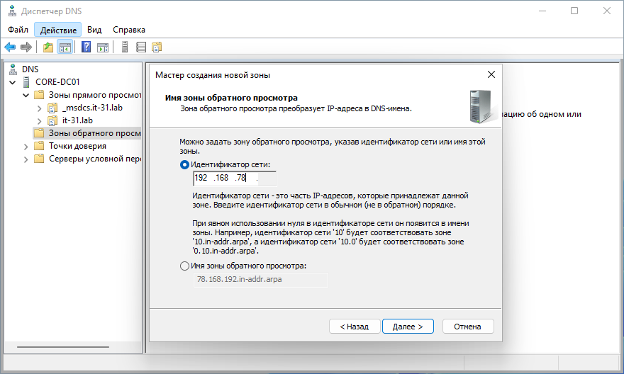 Поэтому откроем оснастку управления DNS и подключимся к любому из серверов, там перейдем к разделу Зоны обратного просмотра и создадим новую зону, при этом укажем параметры: Основная зона - Для всех серверов - Зона обратного просмотра IPv4, после чего укажем Идентификатор сети - первые три октета IP-адреса, на его основе будет сформировано имя зоны.