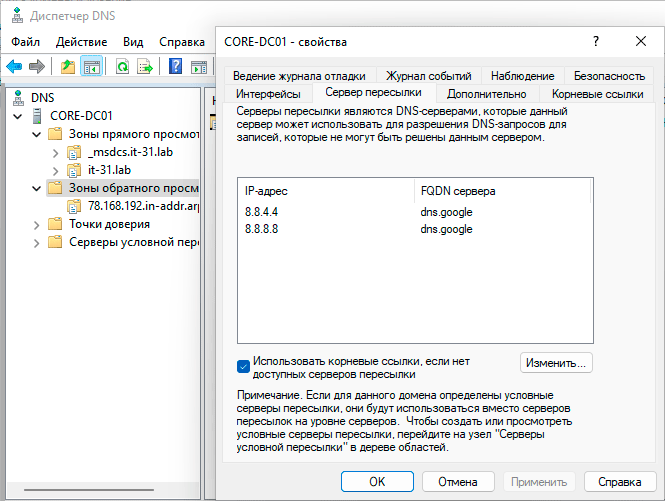 После создания обратной зоны заглянем в свойства самого DNS-сервера и укажем сервера пересылки - список DNS-серверов которым будут отправляться запросы, которые наш сервер неспособен разрешить самостоятельно, в их качестве следует указать адреса серверов имен провайдера или публичные сервера.
