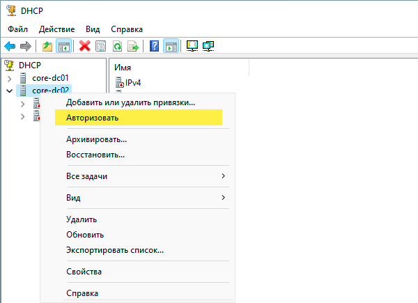На этом настройка DNS-сервера закончена, и мы переходим к финальной части - настройке DHCP. Откроем оснастку управления DHCP-сервером и подключимся к одному из них, прежде всего сервер нужно авторизовать в Active Directory, для этого щёлкните на нем правой кнопкой мыши в открывшемся меню выберите Авторизовать.