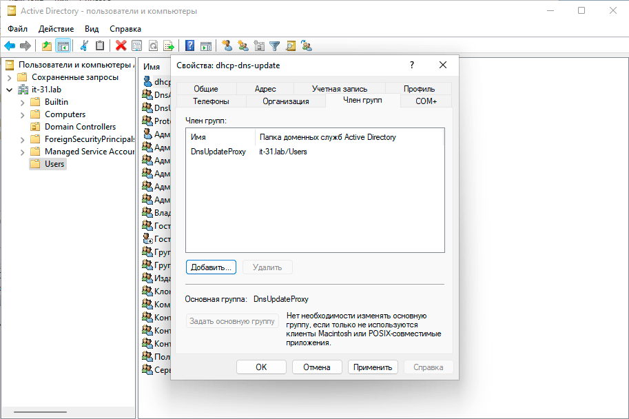 Теперь создадим в Active Directory пользователя, например, dhcp-dns-update и сделаем его членом единственной группы DnsUpdateProxy.