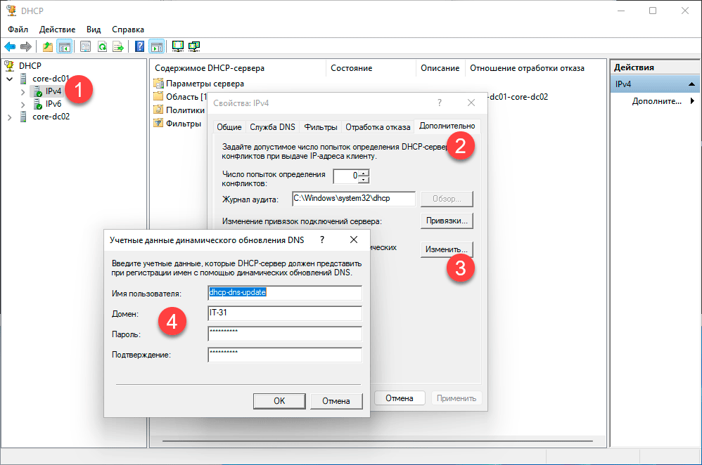 Раскроем дерево сервера, перейдем в свойства IPv4 на закладку Дополнительно и нажмем Изменить рядом с надписью Учетные данные для регистрации динамических обновлений DNS, в открывшемся окне введем данные созданного нами пользователя.