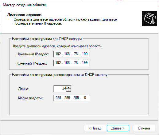 Теперь на одном из них настроим область при помощи мастера, укажем диапазон выдаваемых адресов и маску сети: