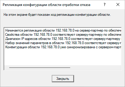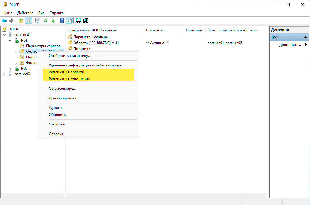 В процессе эксплуатации DHCP-сервера помните, что автоматически реплицируются только данные об аренде, если вы изменили настройки области или выполнили резервирование, то следует запустить репликацию данных вручную, для этого щелкните на области правой кнопкой мыши и в меню выберите Репликация области. Если вы изменили настройки обработки отказа, то следует выполнить Репликацию отношения.