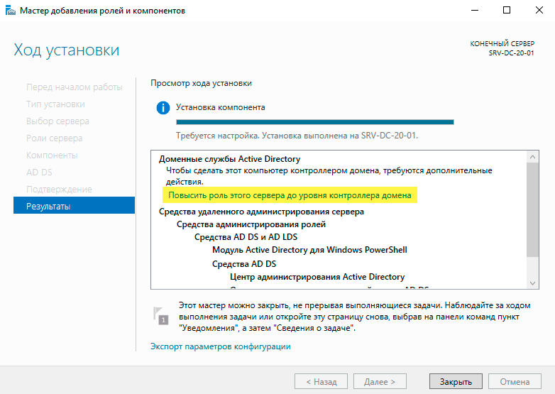 После чего завершаем установку выбранных компонентов и нажимаем на ссылку Повысить роль этого сервера до уровня контроллера домена.