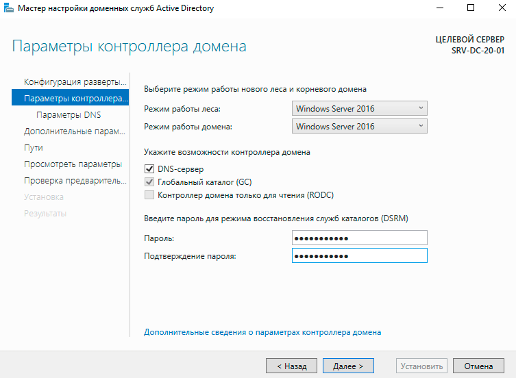 Следующим шагом выберите режим работы леса и домена, максимальный уровень на текущий момент - Server 2016, если у вас подразумевается использование контроллеров домена на Server 2012, то режим работы следует понизить. Далее введите пароль для режима восстановления служб каталогов, остальные параметры оставляем по умолчанию. Текущая практика подразумевает, что каждый контроллер дополнительно несет роль DNS-сервера и становится глобальным каталогом.