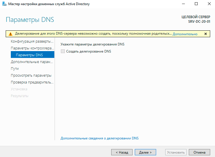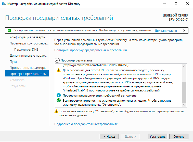 Остальные параметры оставляем по умолчанию, затем дожидаемся итогов проверки предварительных требований, по итогам которого вы получите два предупреждения, которые являются информационными и не мешают продолжить установку. После чего нажмите Установить.