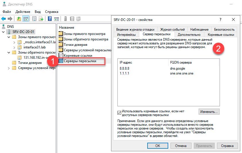 Затем откроем оснастку Диспетчер DNS и откроем пункт Серверы пересылки, это список вышестоящих DNS-серверов, которым будет отправлен запрос на разрешение имен, которые локальный сервер разрешить не в состоянии, здесь следует указать DNS провайдера или публичные DNS. Так как все члены домена должны использовать только доменные DNS функцию DNS-сервера на роутере (если была включена) следует отключить.