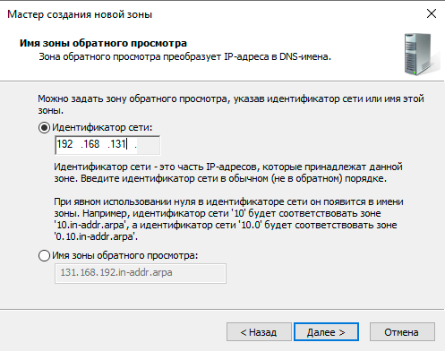 Затем следует создать Зону обратного просмотра, в большинстве случаев это необязательно, но некоторые службы могут требовать ее наличия, либо работать некорректно в ее отсутствие, поэтому лучше потратить немного времени на создание зоны, чем потом потратить гораздо больше времени на диагностику некорректной работы. Для создания новой зоны щелкните правой кнопкой на папке Зоны обратного просмотра и выберите Создать новую зону. В открывшемся мастере укажите Тип зоны - Основная зона.