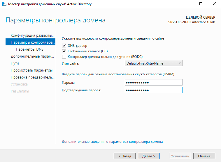 После чего вводим компьютер в домен и входим в систему под учетной записью доменного администратора. Точно также устанавливаем роль Доменные службы Active Directory и повышаем компьютер до контроллера домена. Никаких существенных отличий от первого контроллера здесь нет, разве что отвечать придется на меньшее число вопросов. Точно также включаем роли DNS-сервера иглобального каталога.