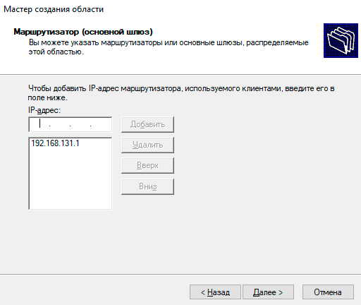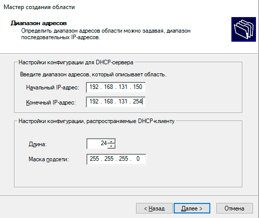 Затем на одном из них приступим к настройке DHCP-сервера, в качестве минимальной конфигурации следует указать диапазон адресов к выдаче: