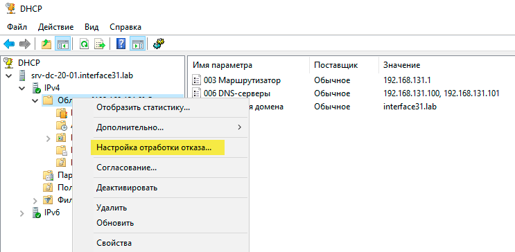 После того как DHCP-сервер настроен следует отключить DHCP на роутере или иных узлах сети. Убеждаемся, что все работает нормально и переходим к созданию отказоустойчивой конфигурации. Для этого щелкаем правой кнопкой мыши на области и выбираем Настройка обработки отказа.