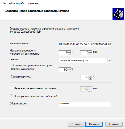 И настраиваем режим работы. В пределах одной локальной сети имеет смысл выбрать Балансировку нагрузки и распределить ее процент, в большинстве случаев 50/50 будет вполне оптимальной настройкой. Для дополнительной безопасности включим проверку подлинности и укажем Общий секрет в виде парольной фразы.