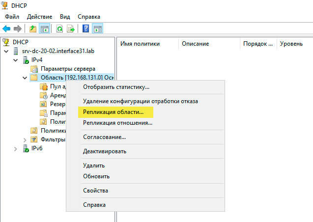 При этом помните, что между серверами реплицируются только сведения о выданных IP-адресах, при изменении настроек сервера или создании резервирования следует выполнить репликацию вручную, для этого снова щелкните правой кнопкой мыши по области и выберите Репликация области.