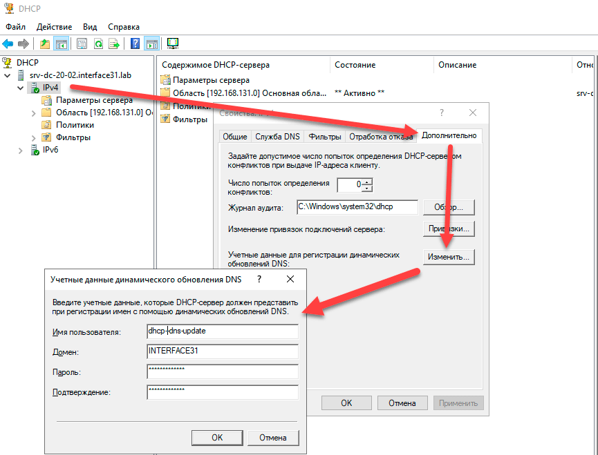 Затем откроем оснастку DHCP, перейдем с свойства IPv4 на закладку Дополнительно и нажмем Изменить рядом с надписью Учетные данные для регистрации динамических обновлений DNS и в открывшемся окне введем данные созданного нами пользователя. Эту настройку следует выполнить для обоих серверов.
