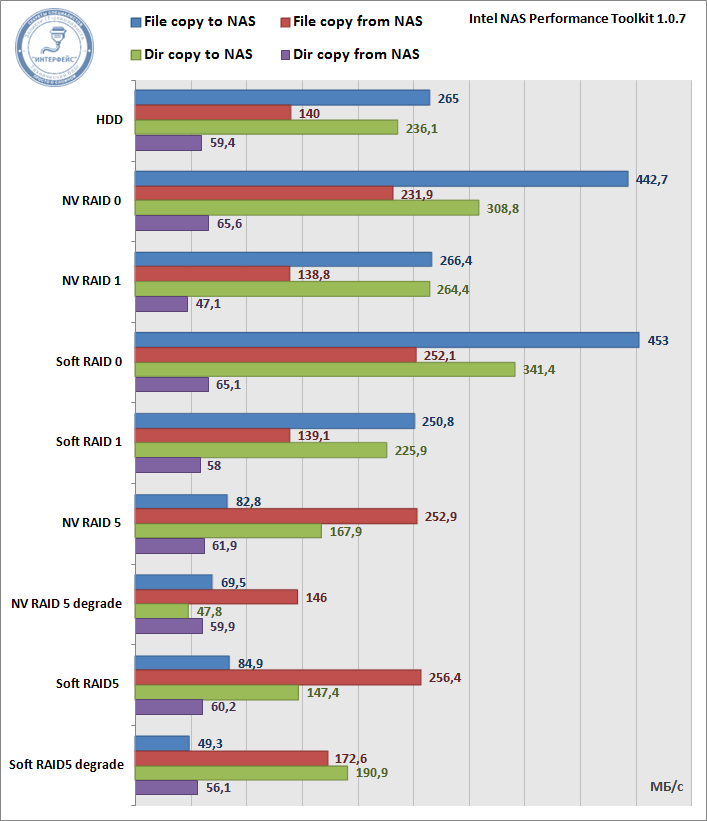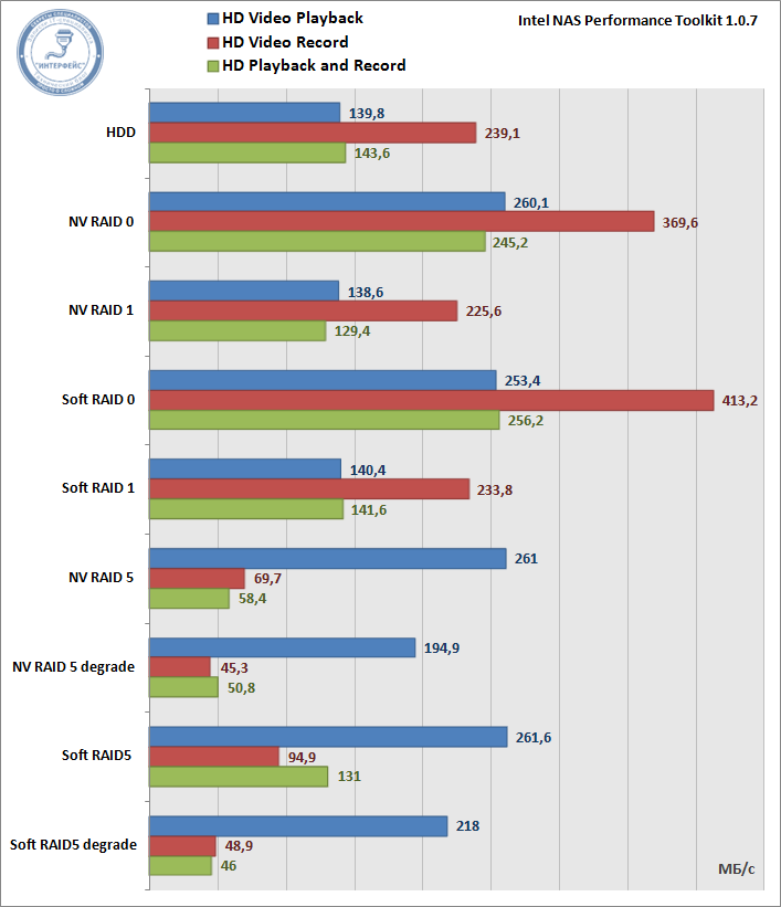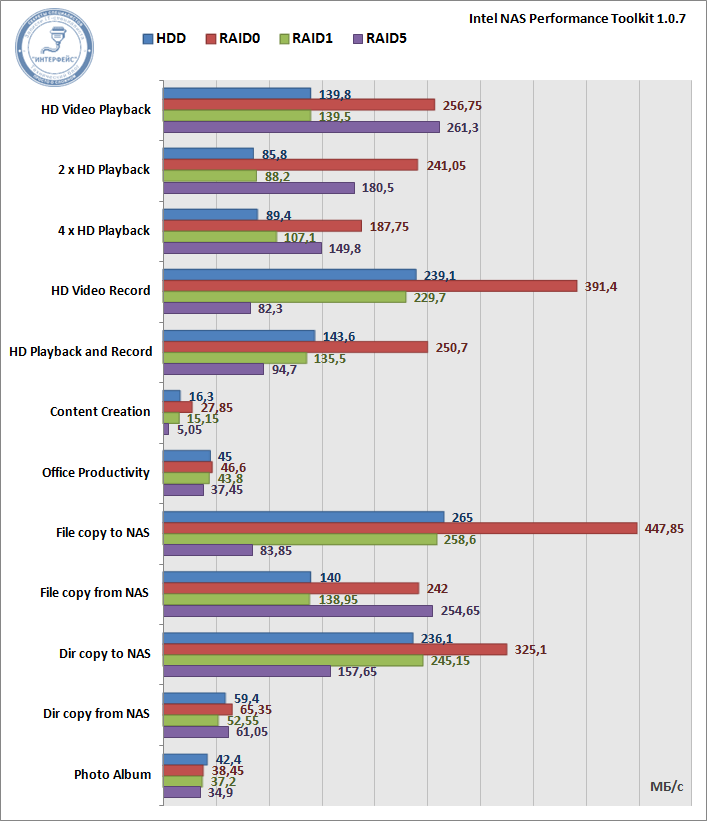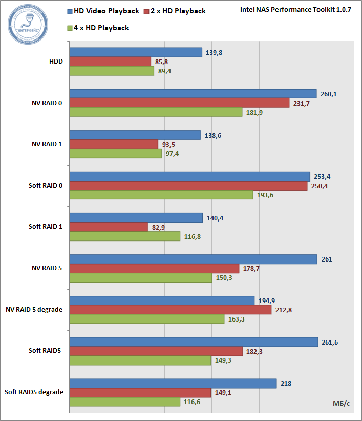 В качестве тестового ПО нами был выбран Intel NAS Performance Toolkit, данный пакет представляет набор тестов, позволяющий оценить производительность дисковой подсистемы на основных характерных задачах. Каждый тест выполнялся пять раз, конечный результат представляет среднее значение. За эталон мы взяли производительность одиночного жесткого диска.