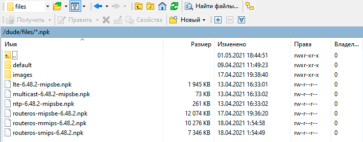 Соединяемся с The Dude сервером при помощи любого SFTP-клиента и размещаем в директории /dude/files файлы обновления RouterOS и дополнительных пакетов из состава Extra.