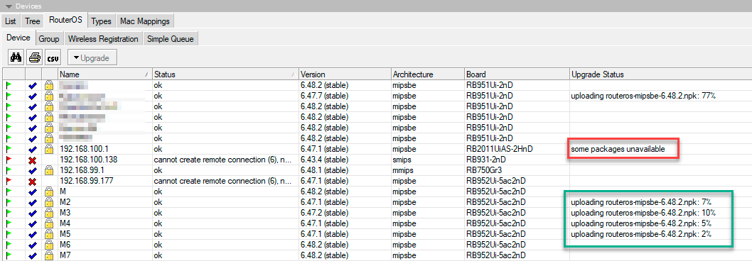 Процесс обновления вы можете наблюдать в колонке Upgrade Status, где будет отображаться выполняемая операция и процент ее выполнения, если же роутеру не хватает какого-либо дополнительного пакета, то вы получите сообщение some packages unavailable, в этом случае следует загрузить в The Dude недостающие пакеты и повторить операцию.