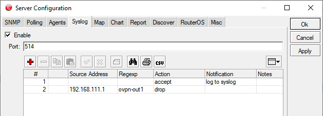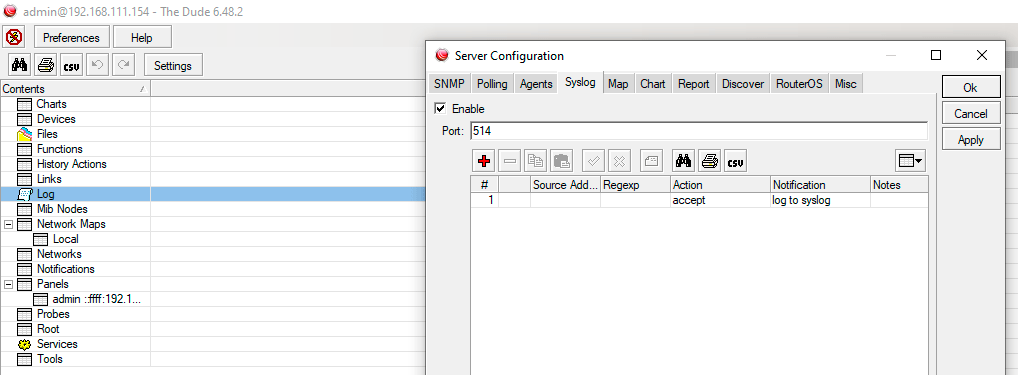 По умолчанию лог-сервер в The Dude включен, чтобы убедиться в этом перейдем в Settings - Syslog где увидим установленный флаг Enable и порт на котором работает служба - 514, ниже расположено правило, указывающее принимать логи из любого источника и записывать их в syslog.