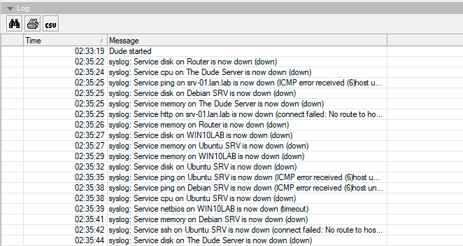 The Dude предоставляет функции сервера логов, но в крайне ограниченном виде, какие-либо инструменты поиска и анализа отсутствуют, а сам сервер фактически является только централизованной точкой сбора логов, со всеми присущими Mikrotik особенностями. Собираемые The Dude логи также хранятся в оперативной памяти и ограничены 10 000 записей, при перезагрузке роутера с The Dude они теряются. Также нет никаких настроек, позволяющих изменить такое поведение, даже если вы используете CHR и не стеснены в ресурсах, как по памяти, так и по дисковому пространству.
