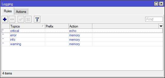 В первую очередь коснемся особенностей ведения логов на устройствах Mikrotik. В целях экономии ресурсов флеш-памяти лог пишется в оперативную память и ограничен 1000 последних записей. При выключении или перезагрузке устройства логи теряются. В целом, если пользоваться логами грамотно и направлять туда только действительно важные события, то 1000 строк вполне достаточно, а в случае диагностики всегда можно включить подробные логи для нужных служб.