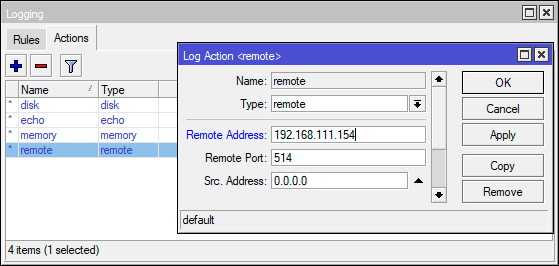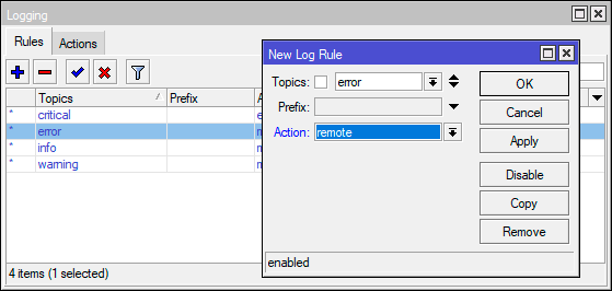 Теперь мы можем перенаправить лог любого уровня на удаленный сервер, просто изменив Action для него, но в этом случае мы окажемся без локального лога, что тоже неправильно. Поэтому мы вернемся на закладку Rules и скопируем нужное правило, указав поле Action для него remote.