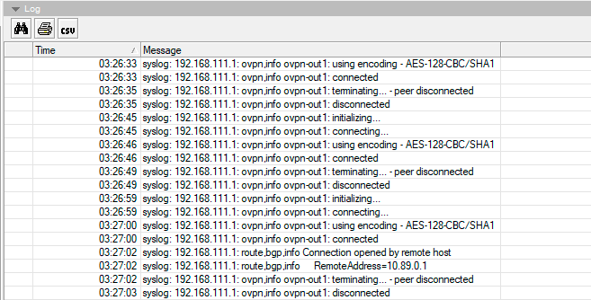 Сам сервер логов по-спартански лаконичен: из возможностей присутствует только поиск и возможность распечатать лог или выгрузить его в CSV. Даже нет возможности наложить фильтр, как это можно сделать в интерфейсе RouterOS.