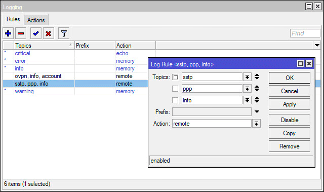 Исходя из того, что возможности хранения логов в The Dude ограничены 10 000 строк напрашивается вывод, что не следует отправлять на удаленный сервер все подряд, а только те логи, которые представляют практический интерес. Допустим мы хотим передавать на удаленный сервер события, связанные с подключением и отключением SSTP-клиентов. Находим в логе нужное событие и смотрим что указано в поле Topics, затем на основании полученных данных создаем новое правило: