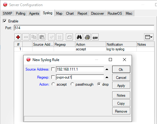 Но фильтровать логи можно не только на стороне отправляющего устройства, но и со стороны The Dude. Если мы взглянем на приведенный выше лог, то увидим, что он заполнен событиями о неудачном подключении к некому OpenVPN-серверу, но это тестовый сервер и в настоящий момент он выключен, поэтому избавимся от этих событий в логе. Снова перейдем в Settings - Syslog и создадим нажатием на кнопку "плюс" новое правило. В поле Source Address укажем адрес источника, в поле Regexp - выражение по которому будем осуществлять фильтрацию, в нашем случае это часть строки, но вы можете использовать всю мощь регулярных выражений. И наконец действие с отобранными строками - drop.
