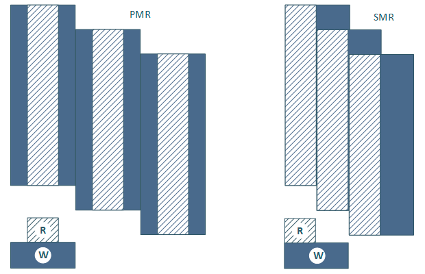 В результате появилось достаточно очевидное решение - писать дорожки внахлест, перезаписывая часть предыдущей, оставляя при этом ширину достаточную для уверенного считывания, такой метод очень похож на укладку черепицы и поэтому получил название черепичной магнитной записи (Shingled Magnetic Recording, SMR).