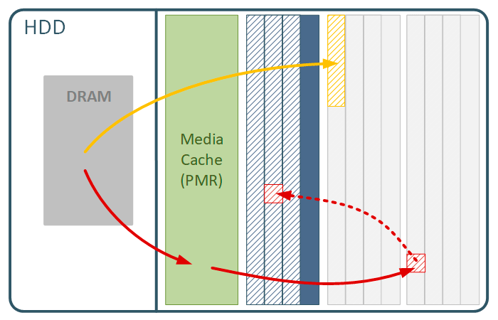 Как можно увидеть из приведенной выше схемы, то диск использует несколько различных алгоритмов, если в наличии есть достаточное количество свободных лент, то запись будет производиться непосредственно в них, если же идет большой поток случайной записи, то ее готов принять в себя медиа-кеш. Но даже потом, диск будет предпочитать писать в свободные ленты, чтобы избежать штрафа на перезапись ленты. Нетрудно заметить, что все это очень напоминает механизм CoW в SSD.