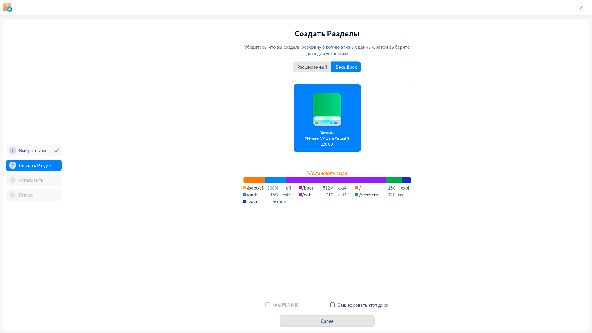 Обращает внимание разметка диска, она далеко не проста и разбить диск по собственному пожеланию здесь не получится. У бывалых, опытных линуксоидов это может вызвать волну возмущения, но не забываем, простой пользователь не будет лазить под капот, ему нужно чтобы включил и работает. Если внимательно присмотреться к разметке, то мы увидим два корневых раздела и раздел восстановления. Все сделано для того, чтобы помешать пользователю сломать систему, даже если что-то пойдет не так и вы все-таки приведете систему в неисправное состояние, то всегда можно загрузиться со второго корневого раздела и восстановить ее из резервной копии.