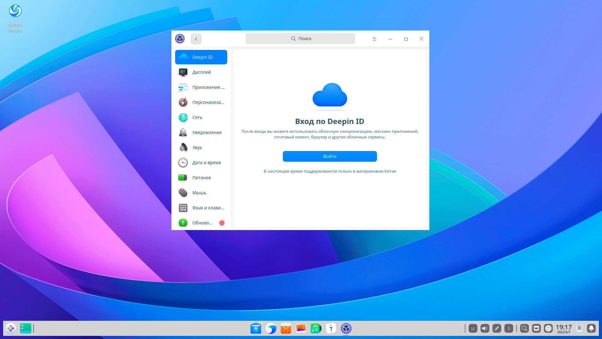 И раз уж мы затронули настройки, то давайте посмотрим, что еще нам там предлагают. Запущенное приложение называется Центр управления и является единой точкой настройки и обслуживания системы пользователем. Как нынче заведено, предлагается вход по Deepin ID и доступ к облачным сервисам, пока только для жителей материкового Китая. Это достаточно сильный ход, облака, как к ним не относись, предоставляют многие сервисные функции, ставшие для многих удобными и привычными, например, синхронизацию между устройствами.