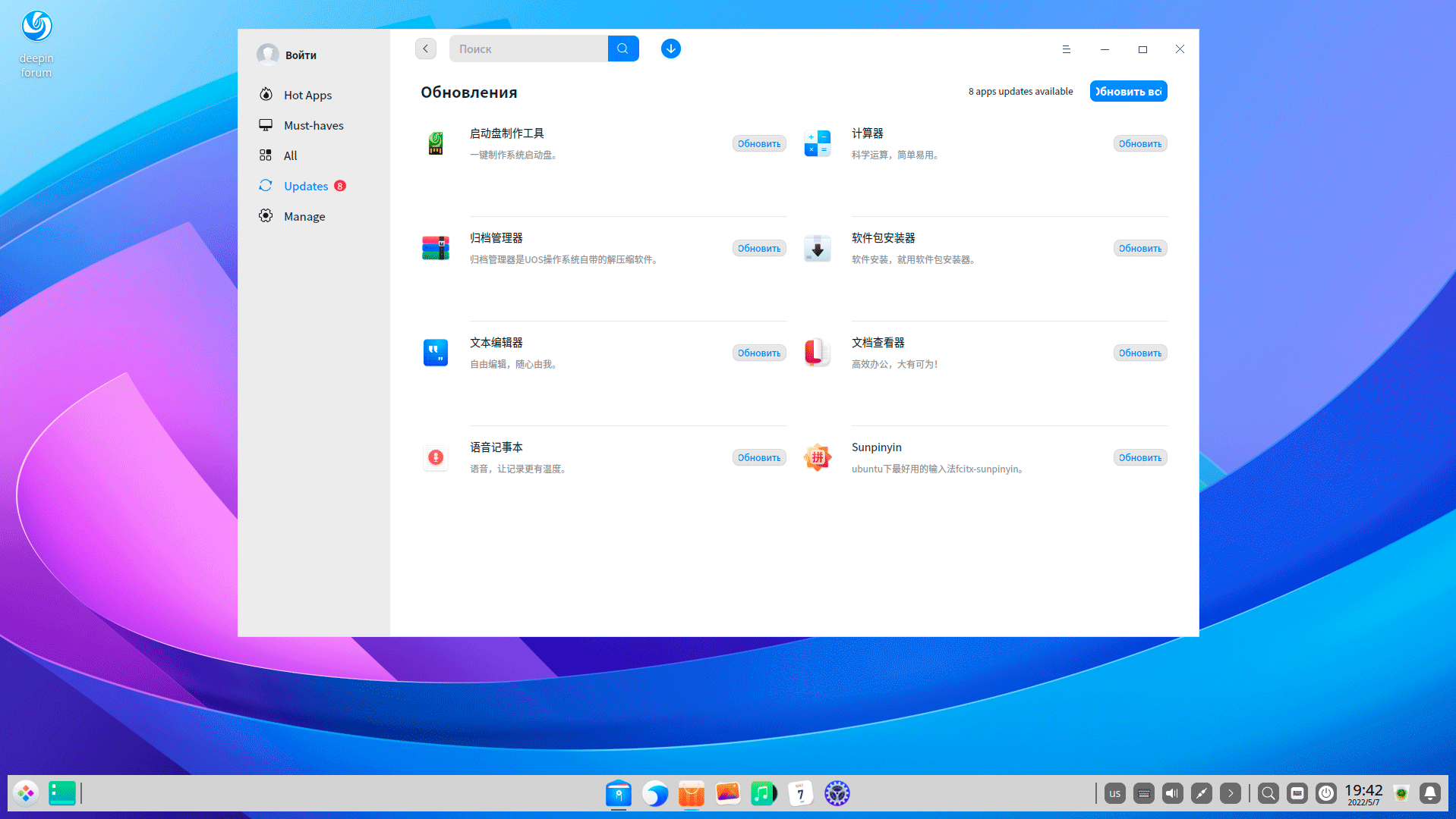 Если внимательно приглядеться к всплывающим сообщениям вверху экрана, то можно заметить, что с русификацией не все хорошо, но с англофикацией тоже, все это еще раз показывает, что Deepin прежде всего китайский продукт. Ниже показана страница обновлений в Магазине Deepin.