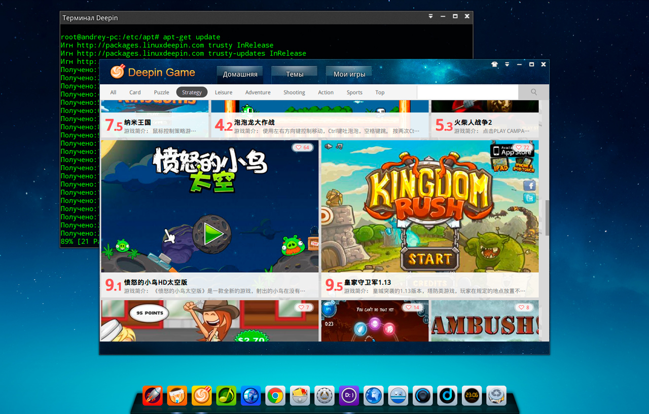 Кроме Deepin Store дистрибутив содержит еще несколько собственных разработок. Одна из них Игровой Центр Deepin, который представляет сборник HTML5 игр, аналогичный ArmorGames и т.п. С одной стороны все это есть в интернете, с другой ничего не надо искать, запускай и играй. Учитывая напряженные отношения линукса с играми этот шаг можно только приветствовать. Хотя сервис явно рассчитан пока только на китайских пользователей.