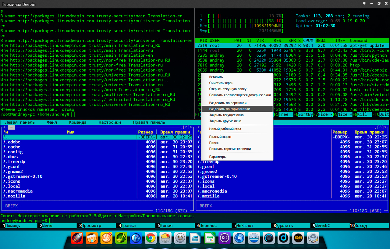 Не забыли разработчики и о продвинутых пользователях, для них предназначен Терминал Deepin. Главной его особенностью является возможность произвольно делить рабочую область, что по достоинству оценят обладатели больших мониторов. Вместо каши окон или переключения между терминалами можно удобно и эффективно организовать рабочее пространство, одновременно контролируя процесс выполнения нескольких задач, попутно просматривая какую-либо полезную информацию, например, нагрузку на систему.