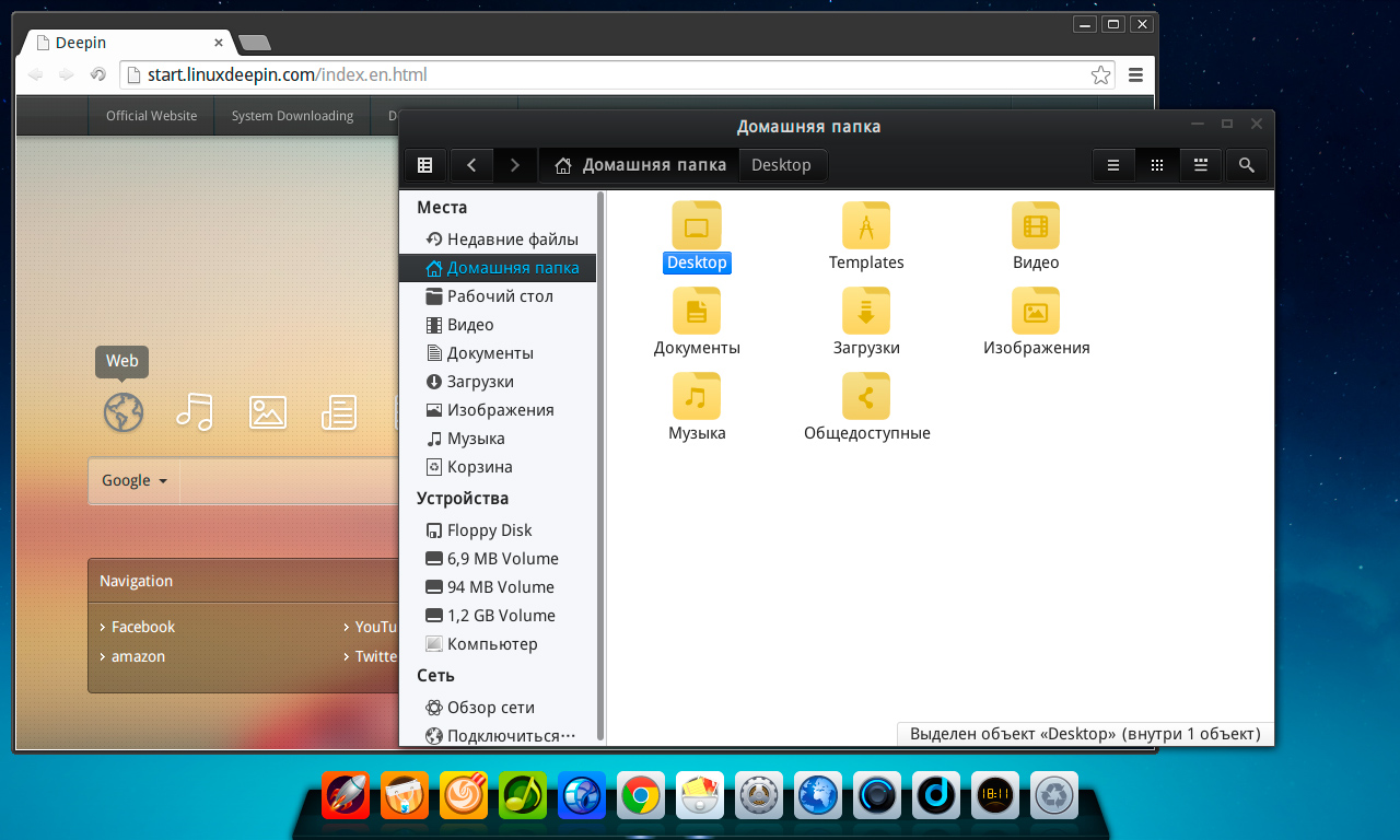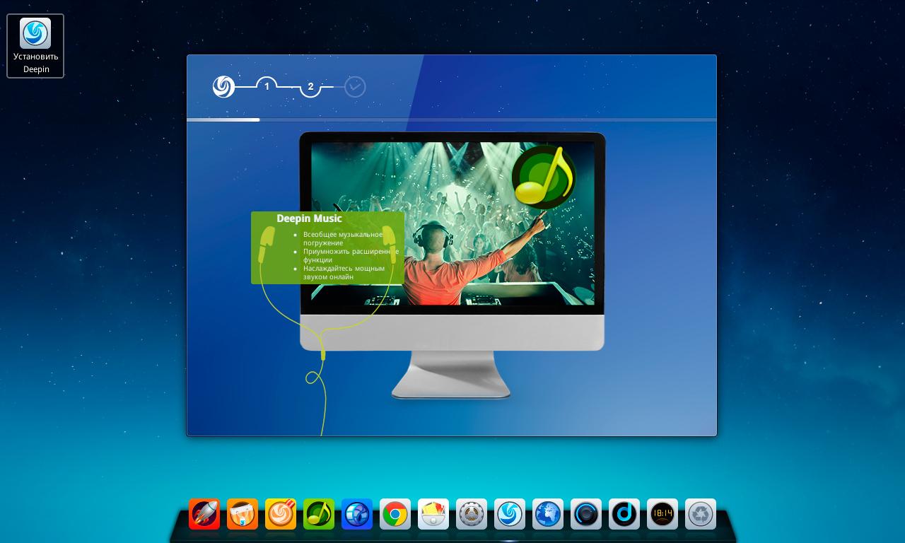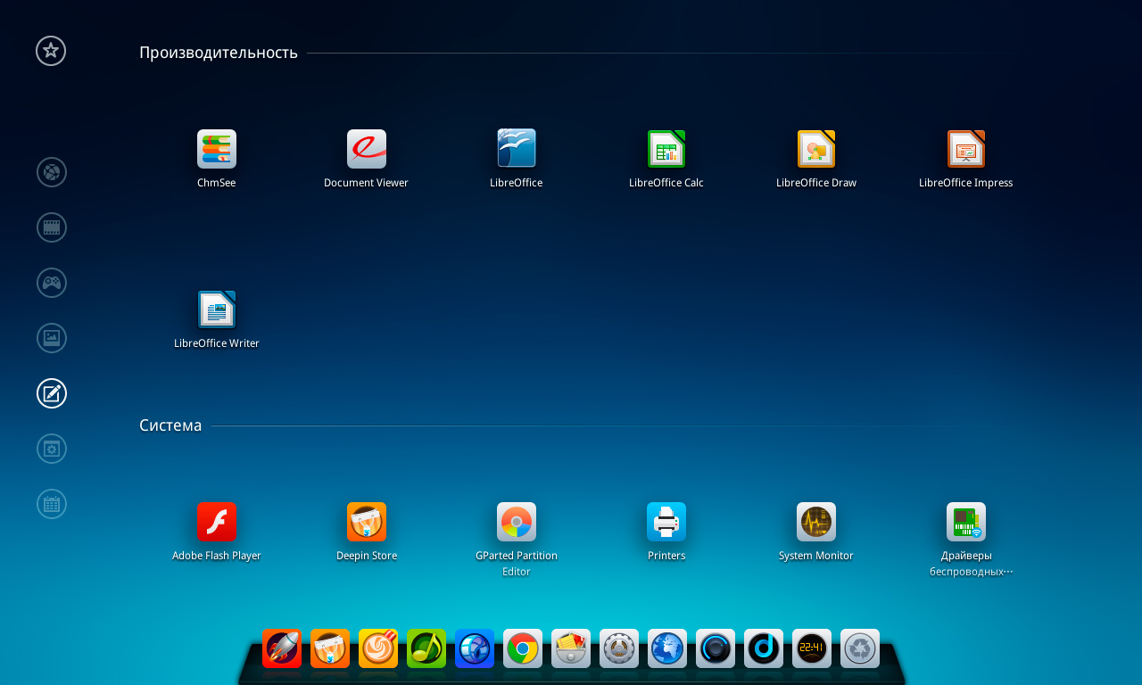 Пройдя "курс молодого бойца", мы попадаем на рабочий стол. Первое впечатление очень положительное, видно, что разработчики вдохновлялись идеями MacOS Х и почерпнули оттуда лучшие стороны. DDE действительно представляет собой полноценное пользовательское окружение. Качество исполнения на высочайшем уровне, мелкие детали интерфейса, шрифты и т.д., которые иногда царапают взгляд и в более именитых дистрибутивах, тут несут следы внимательной работы дизайнеров. Находится и работать в этом окружении нравится с первых минут.