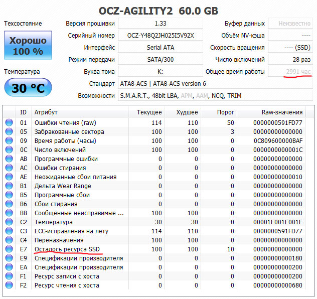 Как видим, по поводу ресурса можно не беспокоиться, отработав 4 месяца в режиме активного использования диск по прежнему имеет это значение на уровне 100% и, как показывает практика, диск будет заменен как морально устаревший ранее чем выработает свой ресурс.