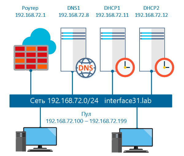 Чтобы вам было легче ориентироваться в адресах и настройках мы привели ниже общую схему сети. В ней мы будем использовать диапазон адресов 192.168.72.0/24 и домен interface31.lab. В данной сети у нас развернуты отказоустойчивые конфигурации DNS и DHCP, и мы добавили на схему все важные узлы.
