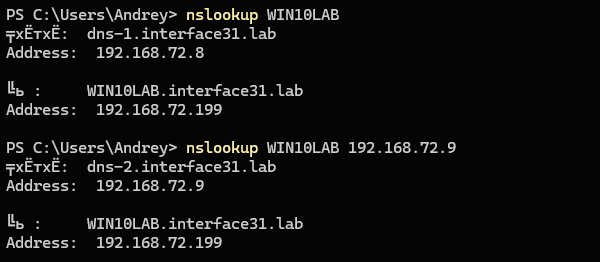 1 nslookup WIN10LAB 192.168.72.9